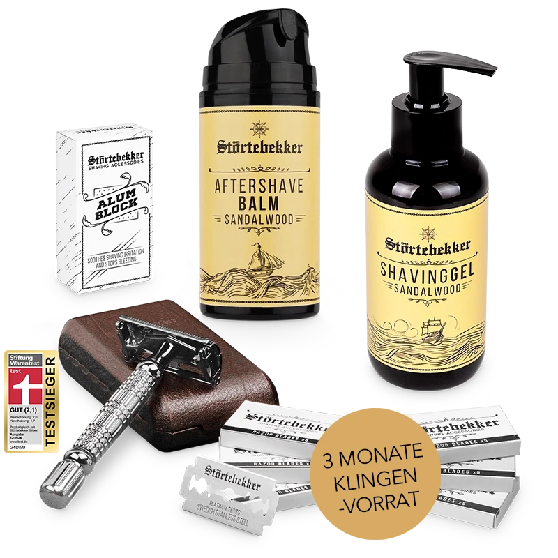 Es besteht aus dem Bestseller Rasierhobel ‘Hamburg‘ in Silber (mit Etui in Café-Braun), dem Rasiergel mit Sandelholz-Duft, dem After Shave Balm mit Sandelholz-Duft, dem Alaunstein ‚Nordfels‘ und 40 Störtebekker Rasierklingen. Diese Produkt-Kombination ermöglicht Dir eine präzise und sanfte Rasur eines kurzen oder 3-Tage-Bartes.
