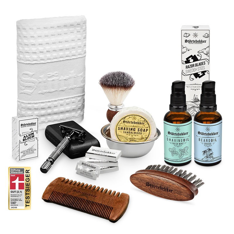 Das Störtebekker All-in-one Set liefert Dir alle wichtigen Produkte für Deine Rasur und Deinen Bart. Es besteht aus dem Bartöl, der Bartbürste ‚Waver‘, dem Bartkamm ‚Corsair‘, dem Rasierhobel ‚Hamburg‘ in Schwarz, dem Rasierpinsel Set ‚Compass‘ mit Sandelholz Rasierseife, den Störtebekker Rasierklingen ‚Platinum‘, dem Alaunstein ‚Nordfels‘, dem Rasieröl Fresh Mint und dem Rasiertuch ‚Polar‘. Mit den Produkten bist Du perfekt auf Deine Rasur vorbereitet und kannst deinen Bart pflegen und stylen.