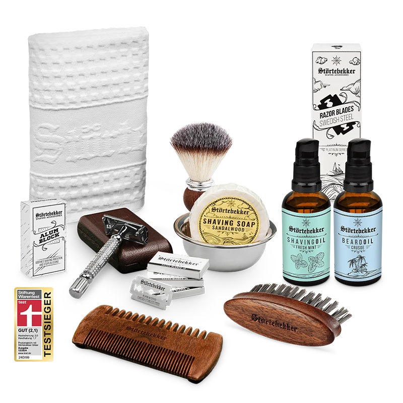 Das Störtebekker All-in-one Set liefert Dir alle wichtigen Produkte für Deine Rasur und Deinen Bart. Es besteht aus dem Bartöl, der Bartbürste ‚Waver‘, dem Bartkamm ‚Corsair‘, dem Rasierhobel ‚Hamburg‘ in Silber, dem Rasierpinsel Set ‚Compass‘ mit Sandelholz Rasierseife, den Störtebekker Rasierklingen ‚Platinum‘, dem Alaunstein ‚Nordfels‘, dem Rasieröl Fresh Mint und dem Rasiertuch ‚Polar‘. Mit den Produkten bist Du perfekt auf Deine Rasur vorbereitet und kannst deinen Bart pflegen und stylen.