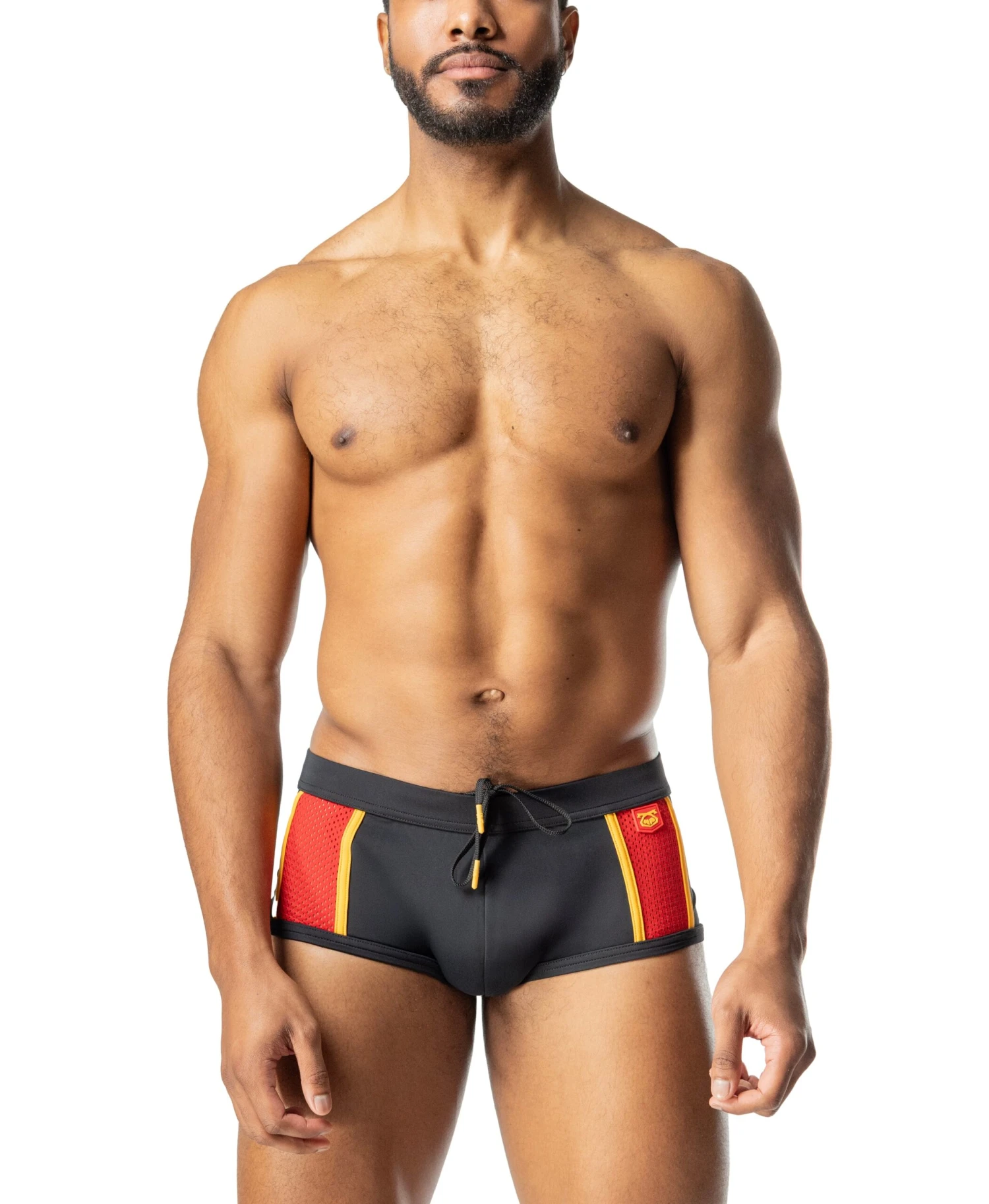 The Contender Square Cut delivers a knockout look with a bit more coverage, perfect for fighters who like to keep it sleek and strong. Inspired by MMA gear, this swim brief brings bold red and gold detailing, breathable mesh panels, and a drawstring waist that stays locked in through every move. Whether you’re poolside or ringside, this sporty Square Cut packs serious heat for Summer ‘25.