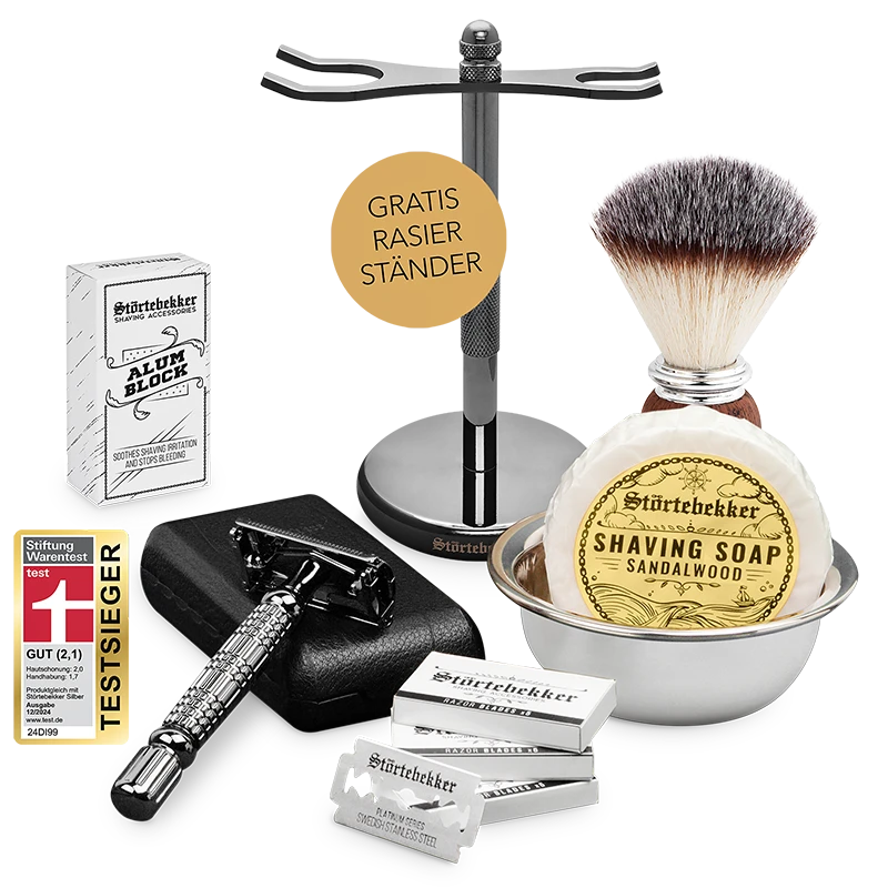 Das Störtebekker Gentleman Essential Set ermöglicht Dir die perfekte Rasur im Stil eines wahren Gentlemans! Es besteht aus dem Rasierhobel Modell ‚Hamburg‘ (in Schwarz oder Silber) inkl. 10 Störtebekker Rasierklingen ‚Platinum‘ und Lederetui, dem Rasierpinsel Set ‚Compass‘ mit wohlriechender Sandelholz Seife, dem Alaunstein ‚Nordfels‘ und einem GRATIS Rasierständer ‚Anchor‘ (in Schwarz oder Silber).