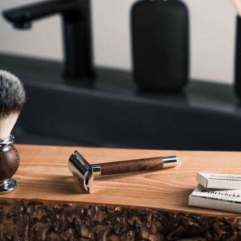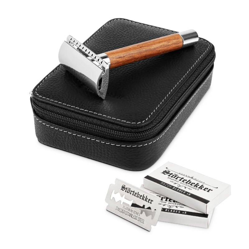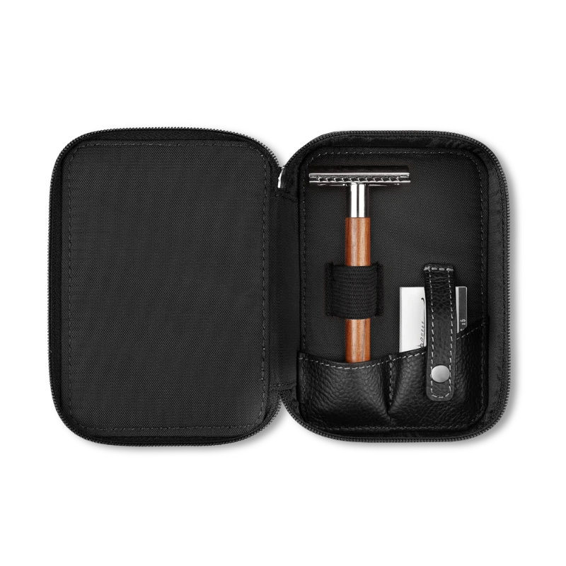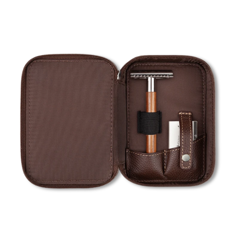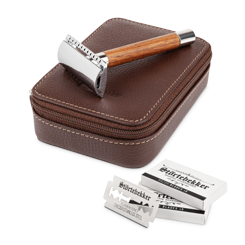 Das hochwertige Set aus dem Rasierhobel Solingen mit Walnussgriff und dem Rasierhobel-Lederetui ‚Harbor‘ von Störtebekker verbindet Qualität, Design und Funktionalität.