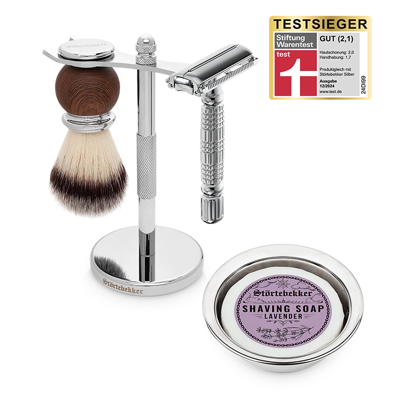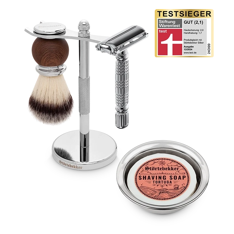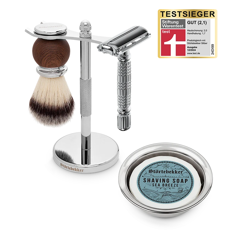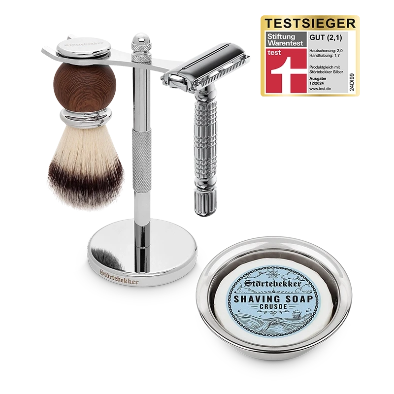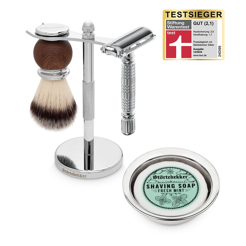 Der geschlossene Kamm des Sicherheitsrasierers schont die Haut bei gleichzeitig hoher Gründlichkeit der Rasur. Außerdem umfasst das Set einen Rasierpinsel, eine Rasierschale aus Edelstahl und eine wohlriechende Seife. Dadurch wird jede Rasur zu einem Erlebnis!