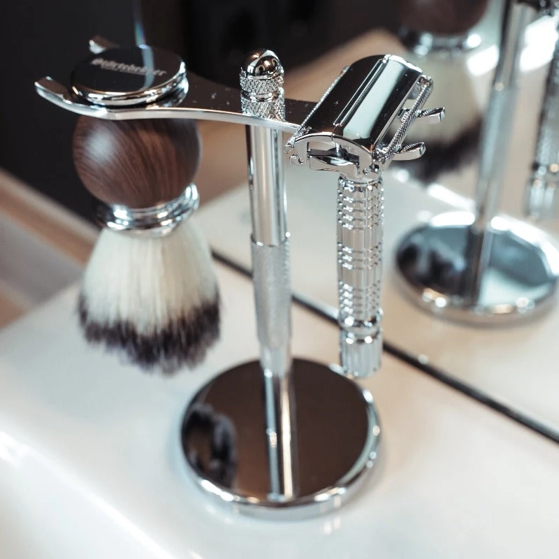 Das Störtebekker Rasierständer Set ‚Anchor‘ ermöglicht Dir den perfekten Einstieg in die Welt der traditionellen Rasur! Es besteht aus dem Rasierständer ‚Anchor‘ in Silber, dem Rasierhobel ‚Hamburg‘ in Silber mit Lederetui in Café und dem Rasierpinsel-Set ‚Compass‘ inkl. einer Rasierseife im Duft Deiner Wahl.