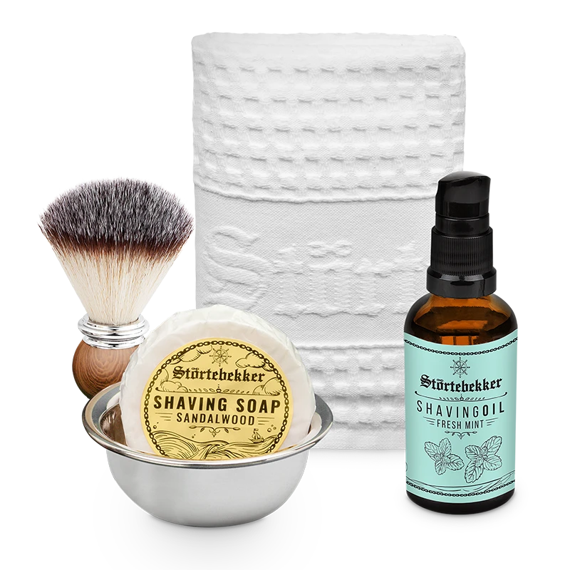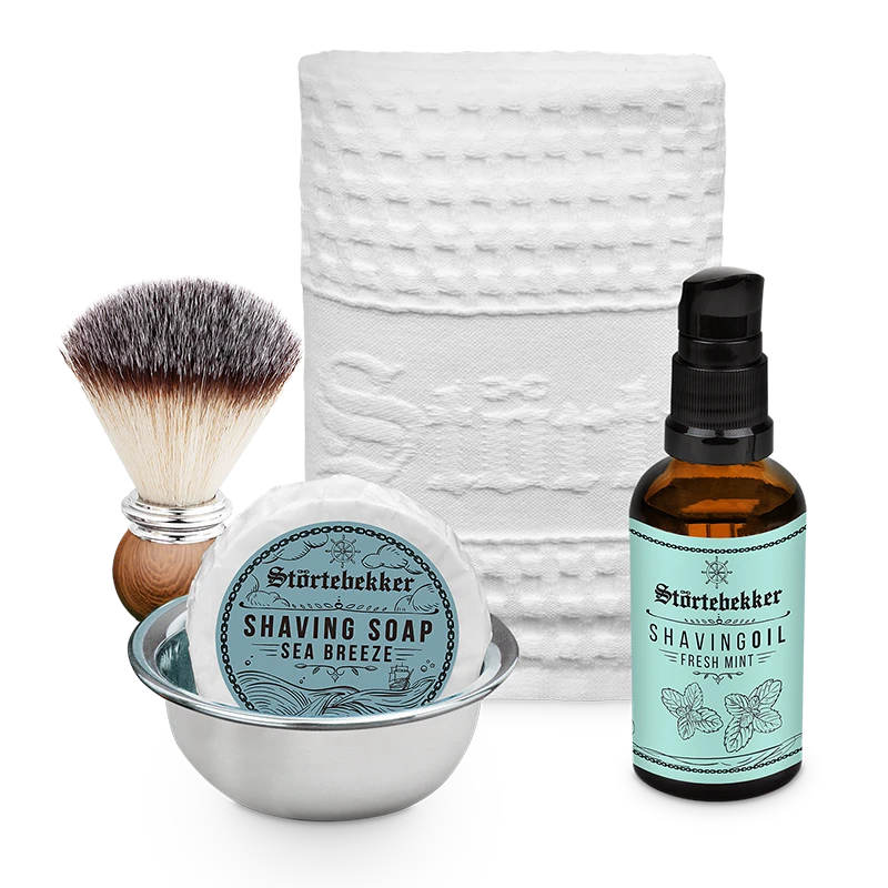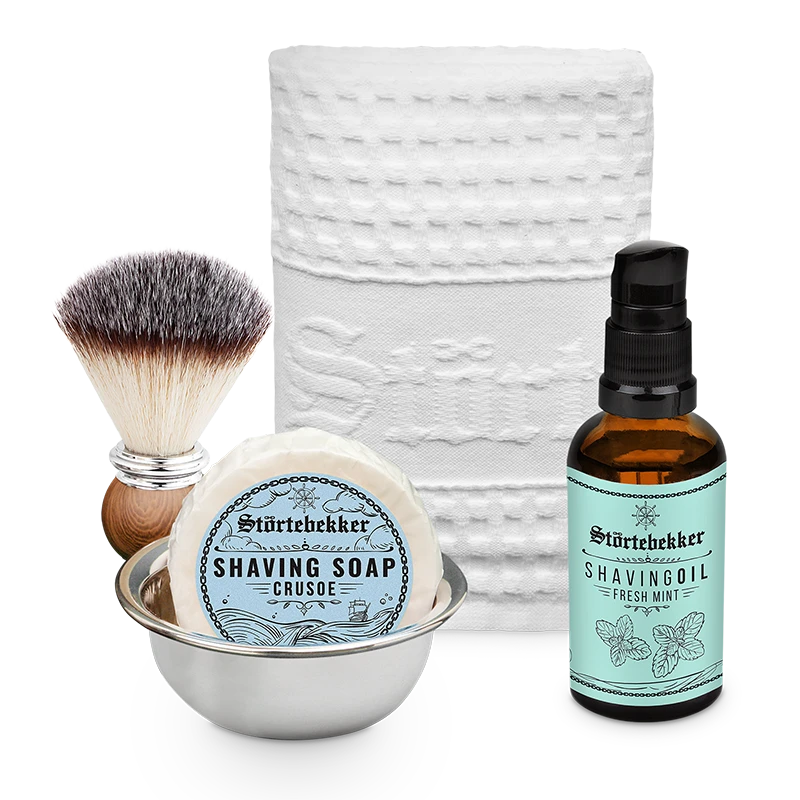 Das Störtebekker Rasurpflege Set liefert Dir alle wichtigen Produkte für Deine Rasurvorbereitung. Es besteht aus dem Rasieröl Fresh Mint, dem Rasierpinsel Set ‚Compass‘ inkl. wohlriechender Rasierseife Deiner Wahl und dem Rasiertuch ‚Polar‘. Mit den Produkten bist Du perfekt auf Deine Rasur vorbereitet und garantierst eine hautschonende Behandlung Deiner Haut.