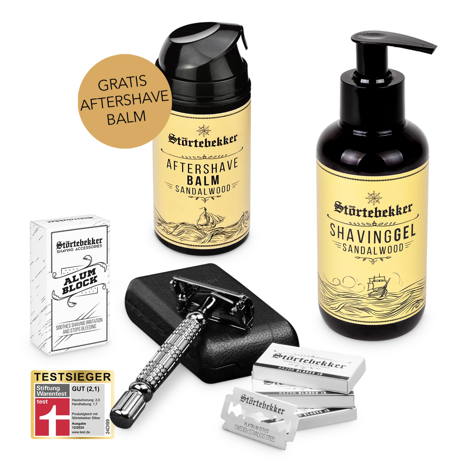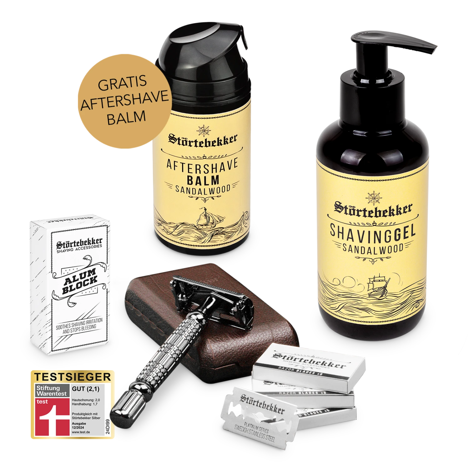 Das neue Störtebekker Rise ‘n’ Shine Shaving Set beinhaltet alle wichtigen Produkte für die klassische Rasurroutine am Morgen. Es besteht aus dem Rasierhobel Modell ‚Hamburg‘ inklusive Lederetui und 10 Störtebekker Rasierklingen ‚Platinum‘, unserem Sandelholz Rasiergel, dem Sandelholz Aftershave Balm und dem Alaunstein ‚Nordfels‘. Mit diesen Produkten steht einer sanften und gründlichen Rasur nichts mehr im Weg und Du bist perfekt auf den Tag vorbereitet!
