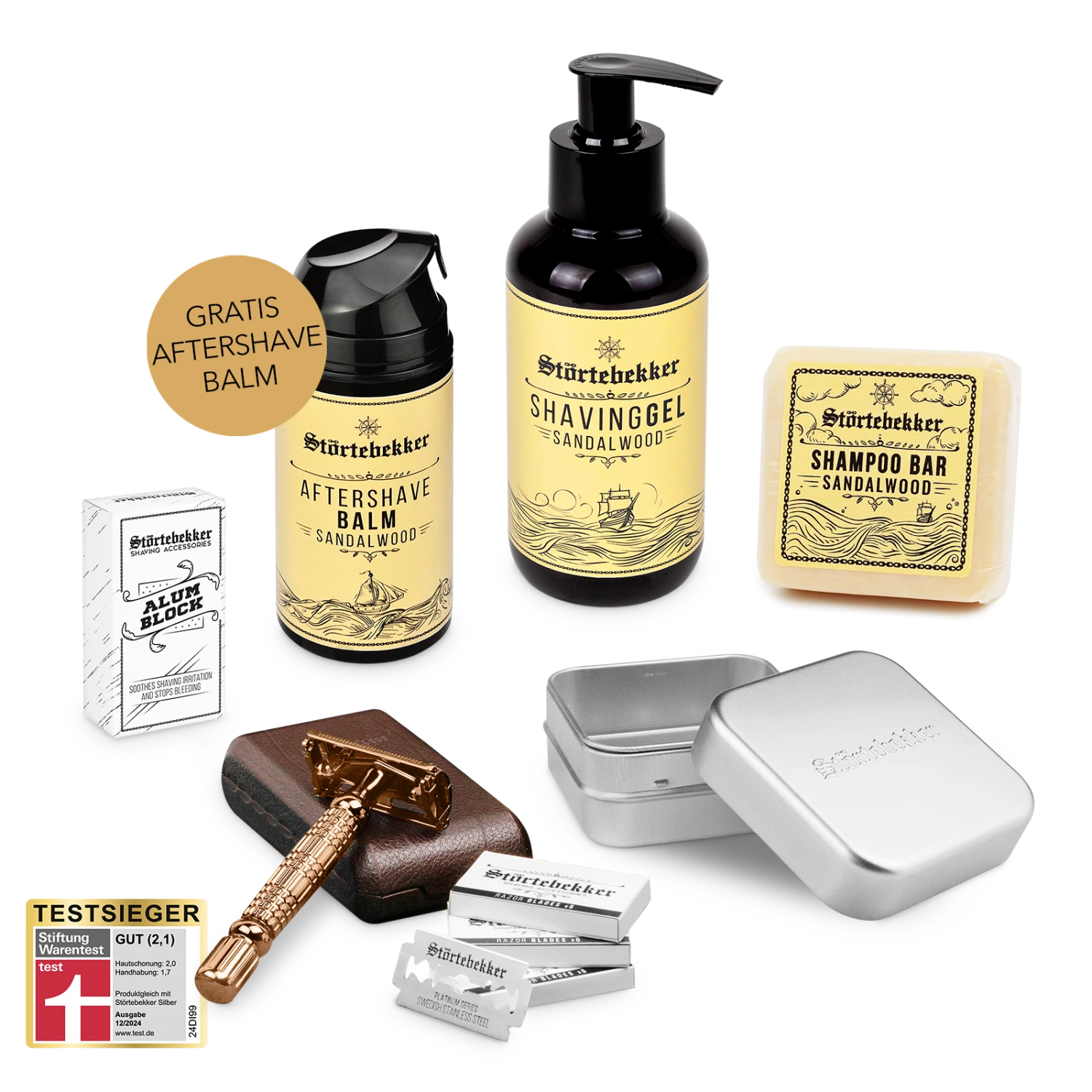 Das Störtebekker Shower & Shave Essential Set liefert Dir alle wichtigen Produkte für deine Dusch- und Rasur-Routine. Es besteht aus dem Rasierhobel Modell ‚Hamburg‘ inklusive Lederetui und 10 Störtebekker Rasierklingen ‚Platinum‘, unserem Sandelholz Rasiergel, dem Sandelholz Aftershave Balm, dem Alaunstein ‚Nordfels‘, festes Shampoo Sandelholz und der praktischen Aluminium Seifendose ‚Treasure‘ zur Aufbewahrung. Mit diesen Produkten steht der optimalen Pflege- und Rasur-Routine nichts mehr im Weg und Du bist perfekt auf den Tag vorbereitet!