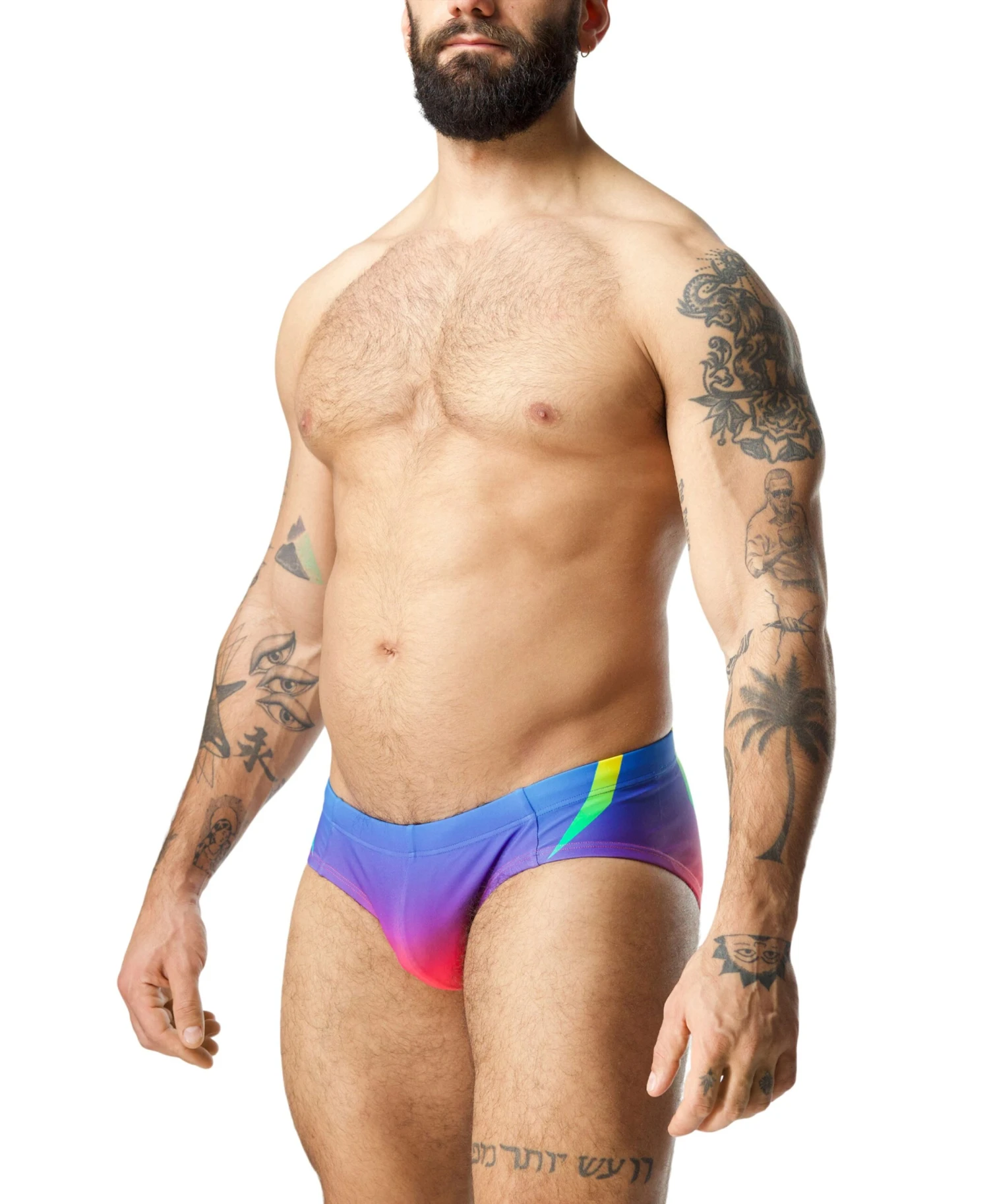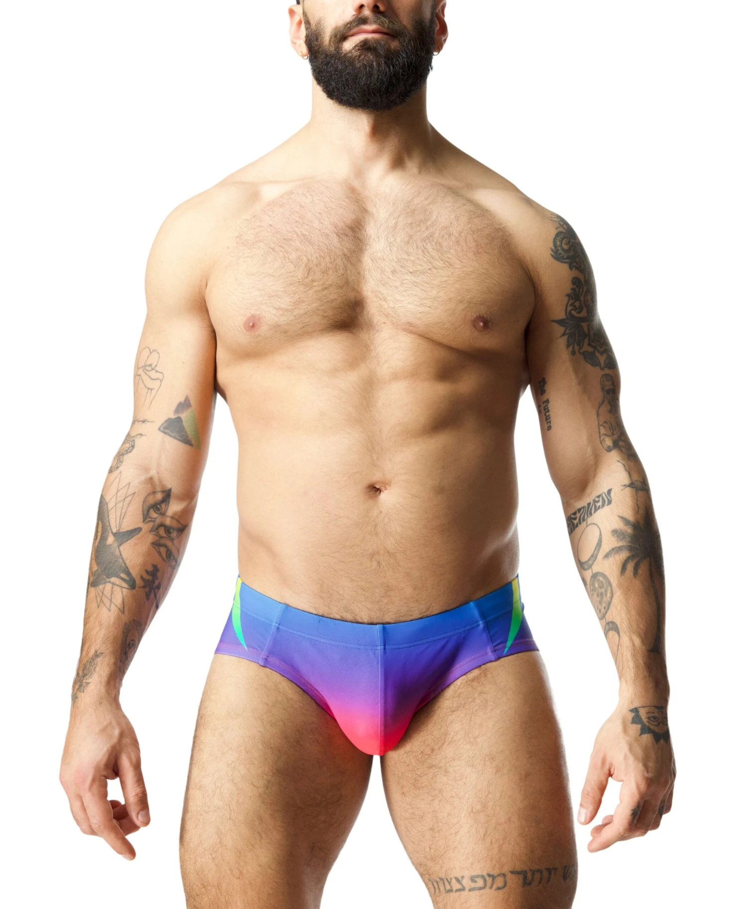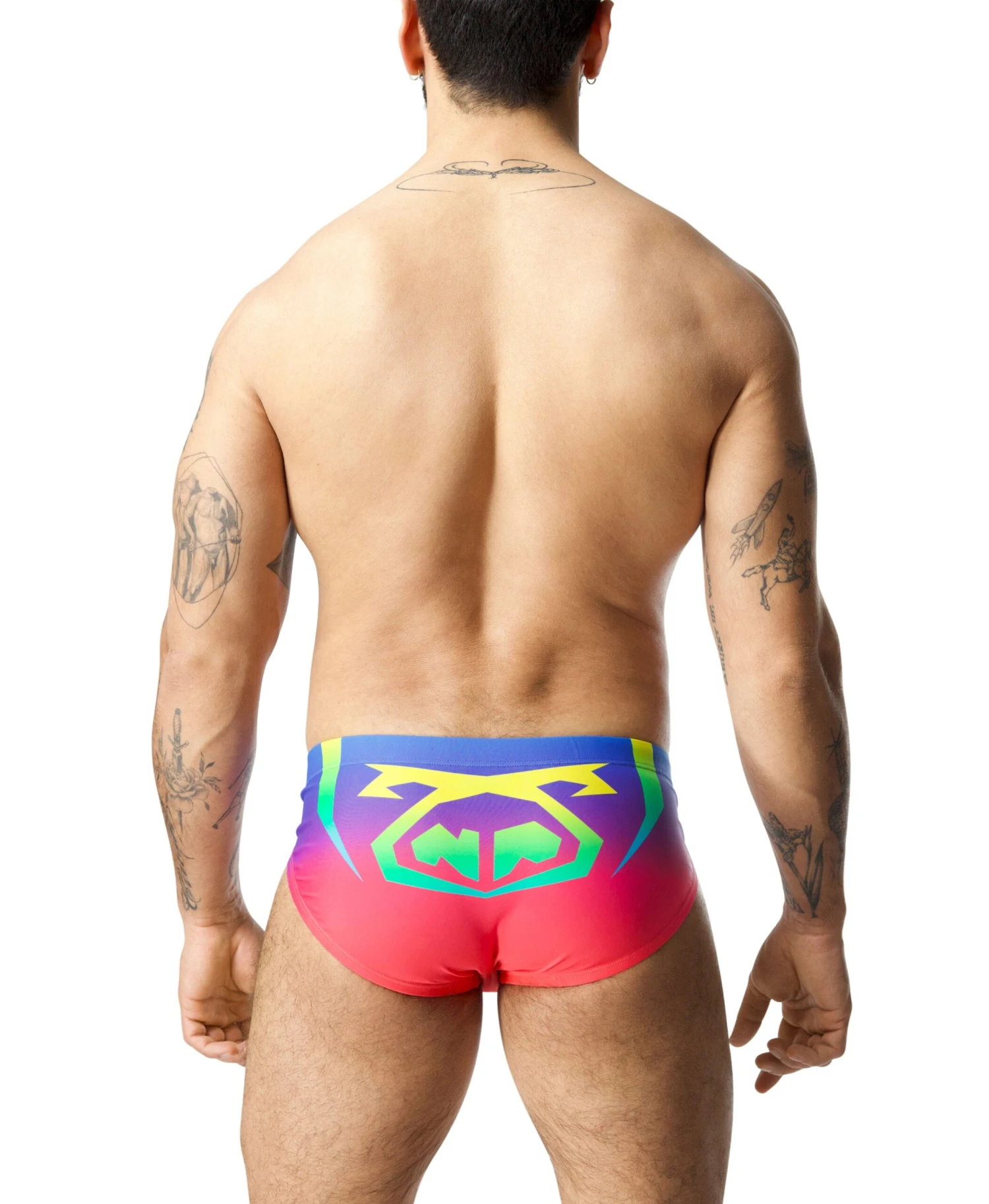 The Synth Bikini doesn’t play it safe—it plays it tight. With a bold gradient that fades from deep violet to hot crimson, this swim brief grips just right around your package for a sculpted, secure fit that holds you where it matters. The back features a neon-charged NP logo that flashes attitude with every move. It’s stretch-built, splash-ready, and made to own every angle—front and back.