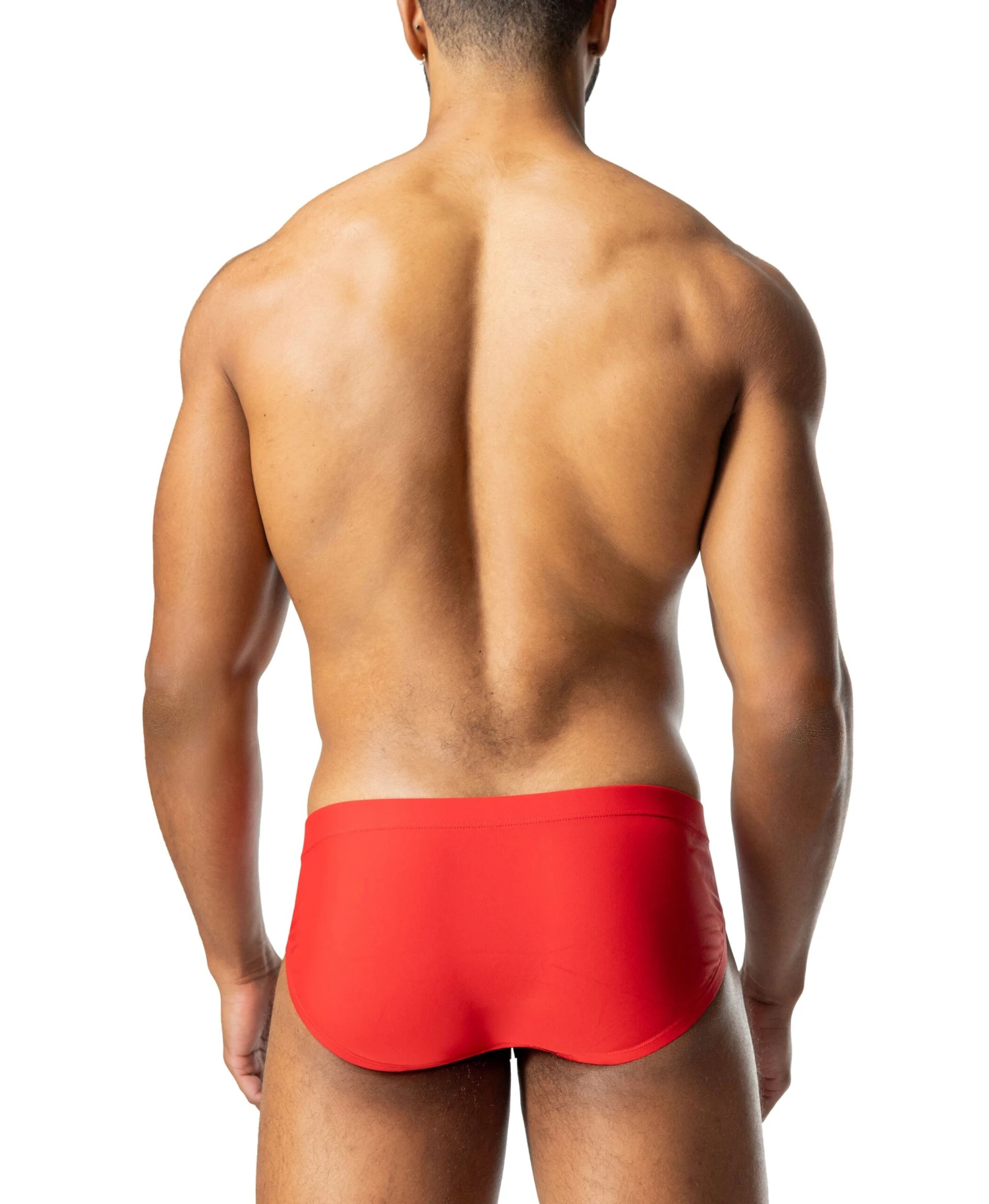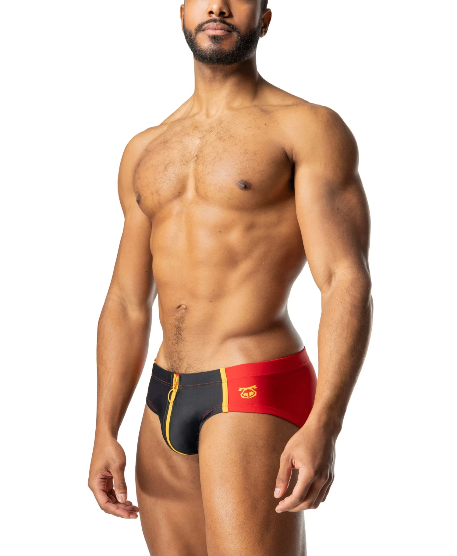 Step into the ring and strip down to win in the TKO Bikini. This fighter-cut swim brief hits hard with a bold color combo and a functional front zipper that lets you control the pace of play. Red and gold stitching punch through the front section of the Bikini, while the Snout logo delivers a finishing blow of attitude. Whether you’re training, teasing, or ready to tap out, this bikini is built for champions.